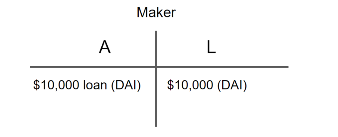读者可能会奇怪,抵押进 Maker 的 ETH 为什么不出现在 Maker 的资产负债表中呢?因为抵押并不是一种所有权转移,而是为贷款增信的合同行为。抵押之后,ETH 的所有权并没有转移给 Maker,不能算成 Maker 的资产。Maker 创造 $10,000 DAI 的依据是贷款,而不是抵押进去的 ETH。