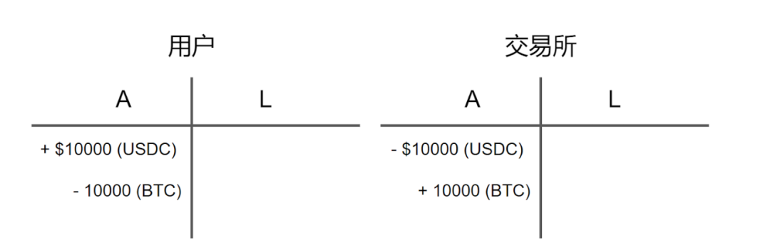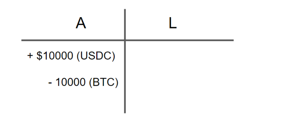 举一个例子,一个用户把自己价值 1 万美元的 BTC 出售,兑换为 1 万美元 USDC。这个交易只影响该用户 BTC 和 USDC 的数量,不影响 其他资产和负债项,因此表达为增量平衡表,其他项目不列出,只需要把 BTC 和 USDC 的增减表达出来即可: