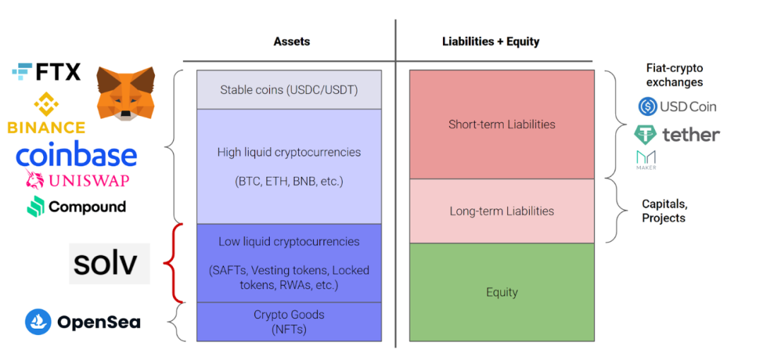 第三,帮助发现创新机会和梳理业务战略。资产负债表所提供的资产洞察,有时可以帮我们发现市场的空白点和潜在机会。Solv 就是这样一个例子。Solv 作为支持用户自定义多维资产的平台,远期目标清晰,但业务切入点的选择十分不易。我们在进行战略思考的时候,制作了下面这样一张全行业资产负债表,看到了低流动性资产(SAFT、锁仓 tokens、真实世界资产等)的空白机会,因此决定从这个领域切入,取得了良好的效果。