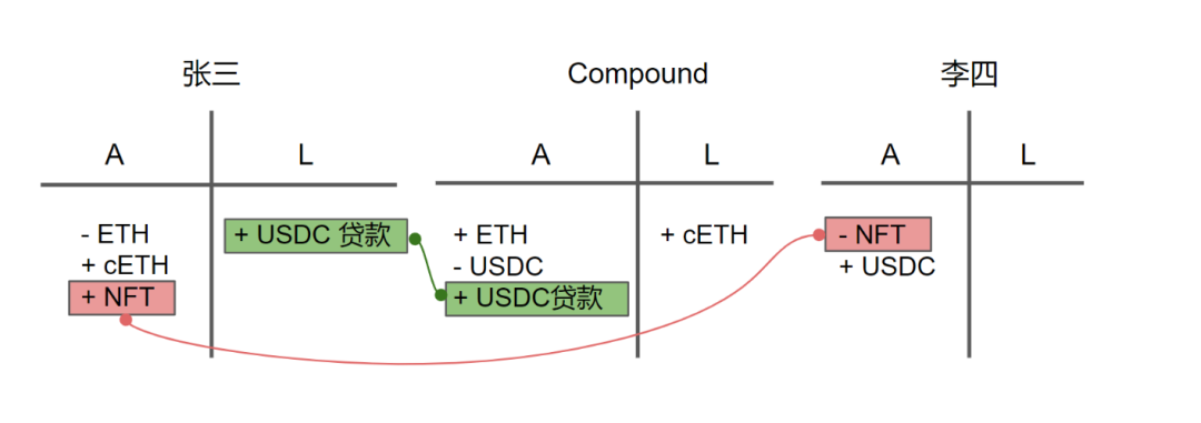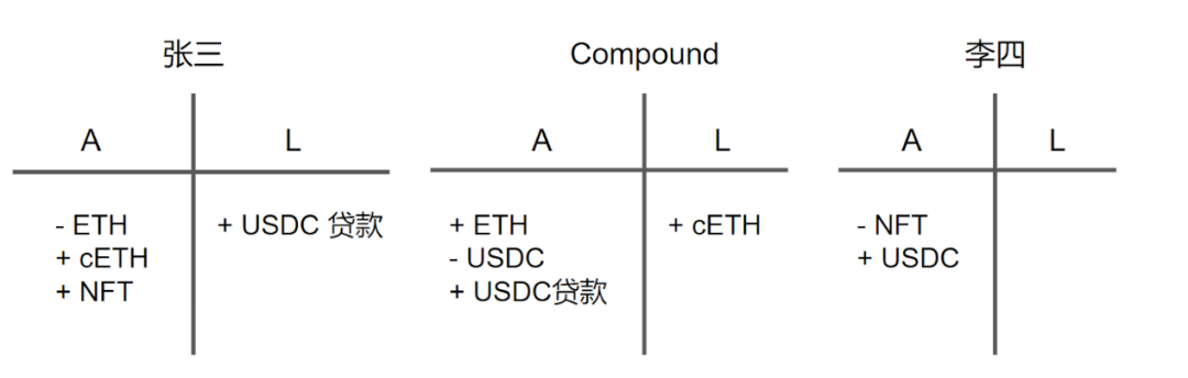 很多时候,我们并不关心资产的数量,而是定性地研究交易涉及到各主体资产负债关系变化,这种时候,可以忽略数字。例如,假设张三将若干 ETH 抵押到 Compound 里那里,借出 USDC,然后从李四那里购买了一个 NFT。假设我们不关心此次交易的具体金额,只是定性分析,那么联合增量平衡表如下: