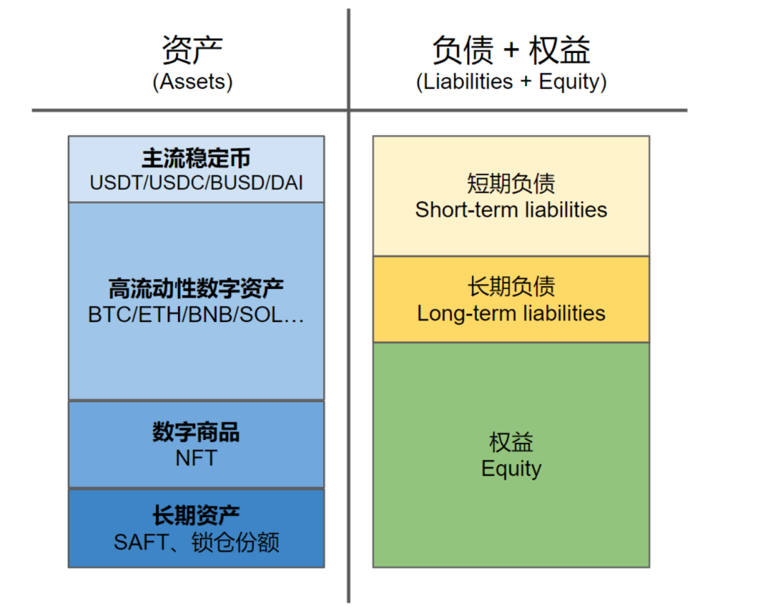 图 2 可能是某一个以纯数字化 DAO 组织的资产负债表的样貌。我们后续的探讨可以以此为一个出发点。