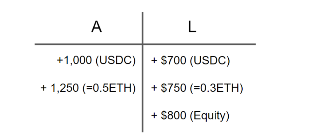 假设过了一段时间,他做市获得收入 1,000 USDC 和 0.5 个 ETH,但同时累计的未支付利息达到 700 USDC 和 0.3 个 ETH,与此同时 ETH 价格上涨至 $2,500,则增量平衡表显示如下: