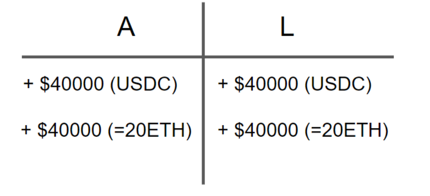 再举一个例子,假设在一个 ETH 价值 2,000 美元的时候,一个用户借入 4 万 USDC 和等值的 20 个 ETH 用于做市,增量平衡表显示如下: