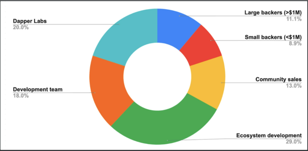 FLOW 是 Flow 公链流通的通证,初始发行量为12.5 亿枚,其中 Dapper Labs 持有 20%,私募占 20%,公募占 13%,剩下 29% 用于生态发展。