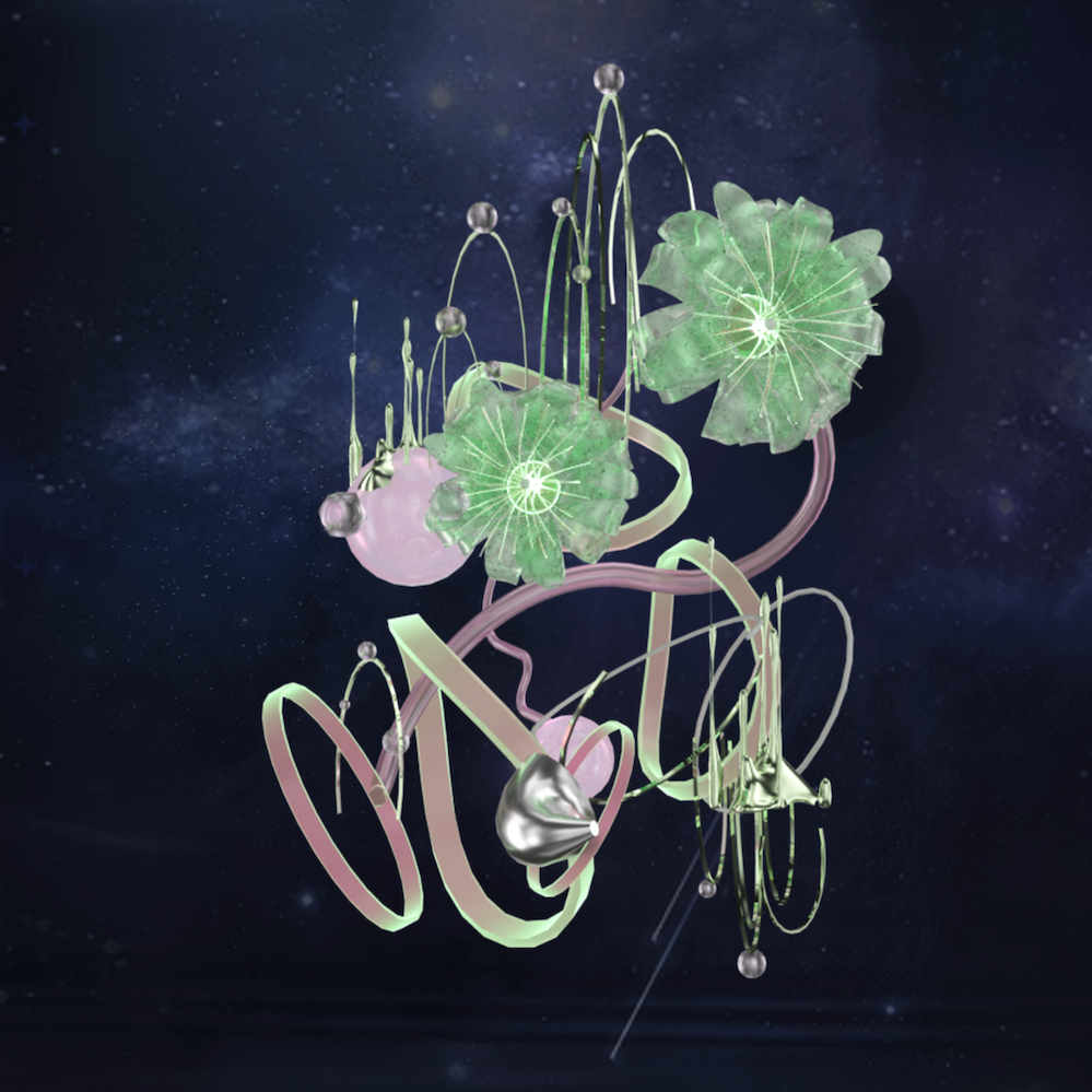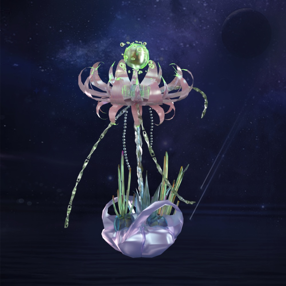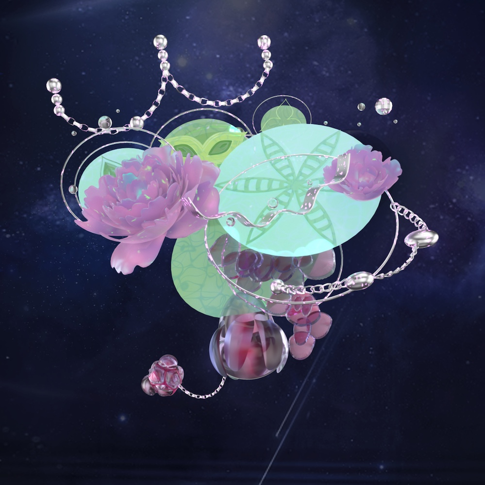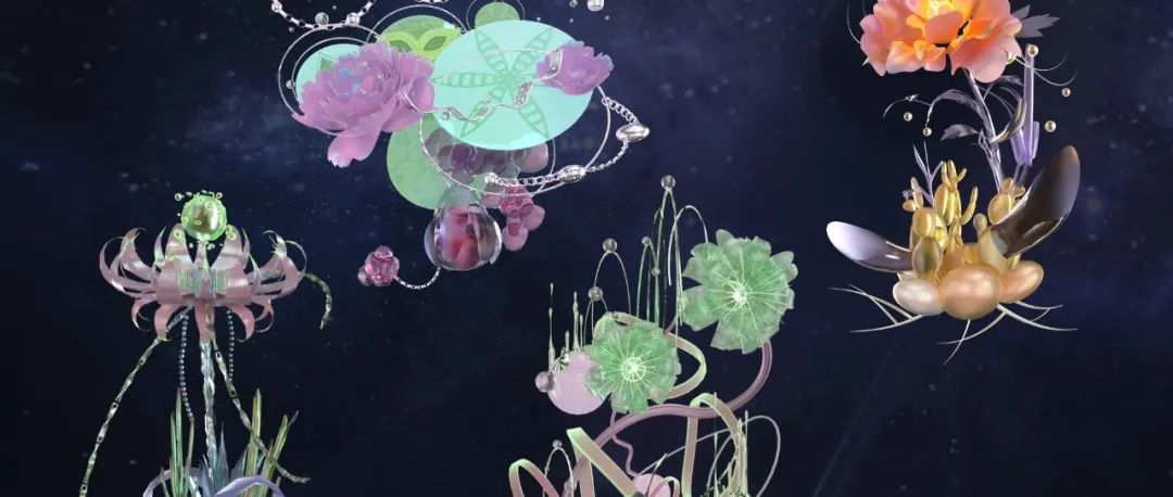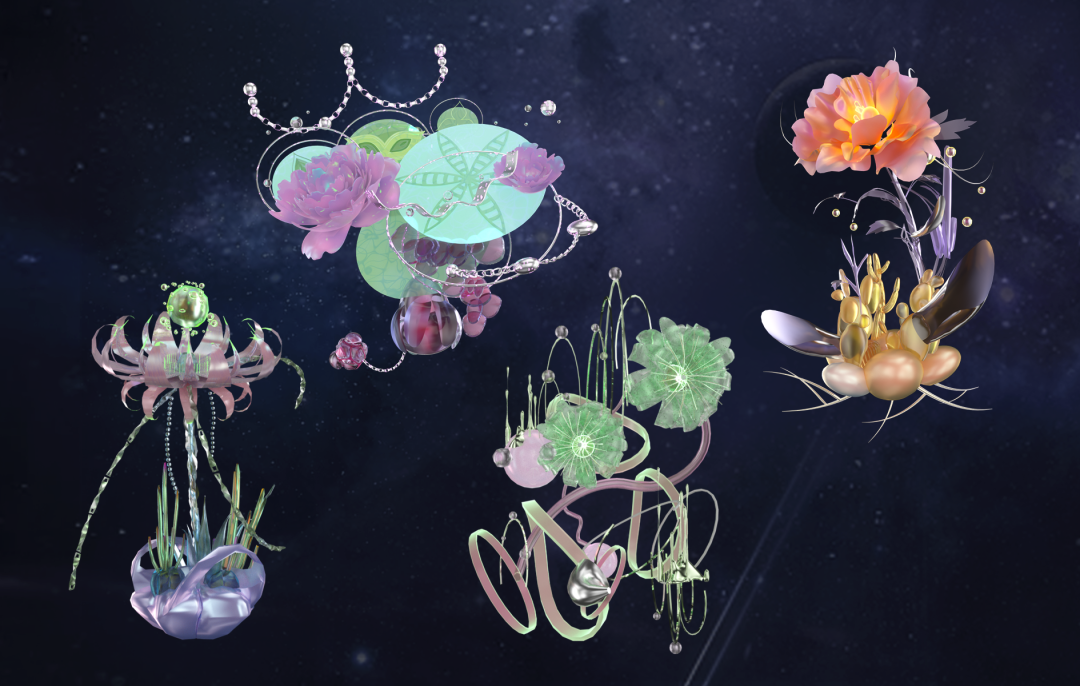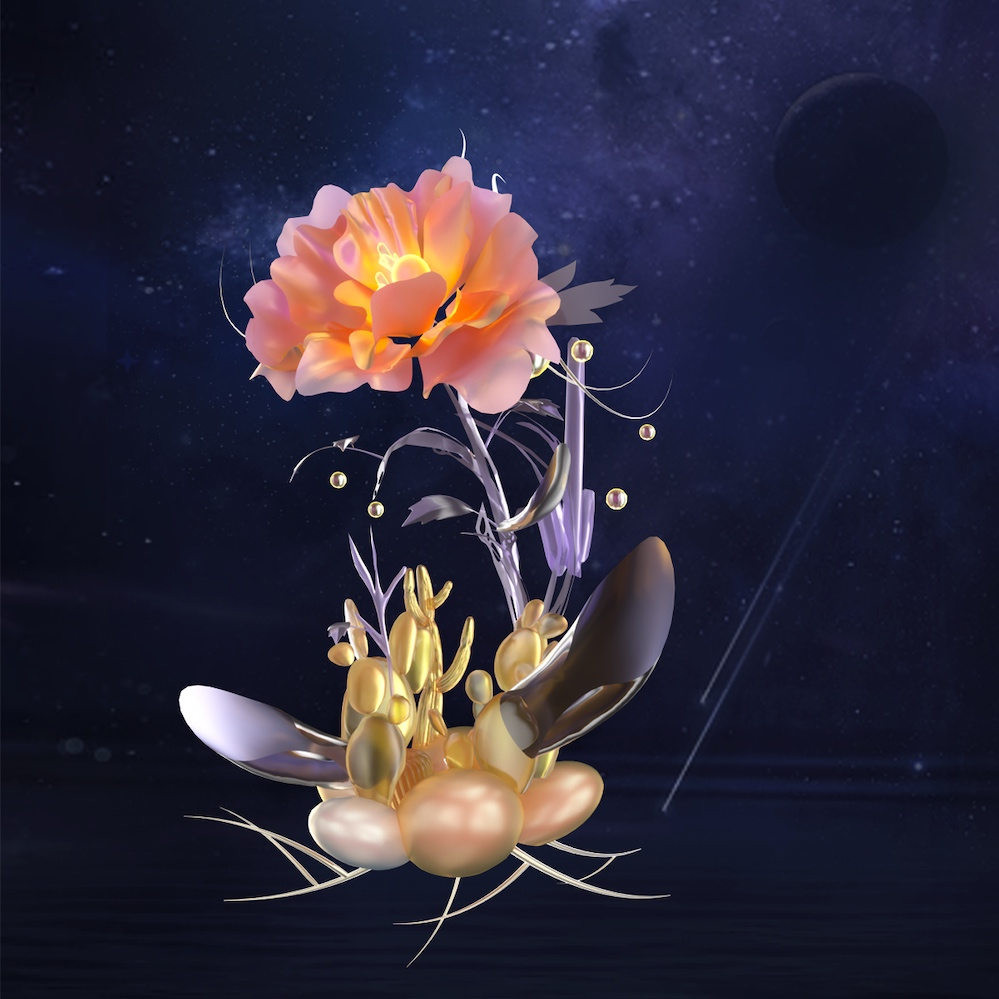 未来虚拟世界中的花朵是科幻艺术品,通过区块链和数据化的方式,得以永生,每一朵花卉的芬芳、生命力和能量,通过更具永恒感的材质,例如金属、陨石、琉璃等,展现出厘里所处的虚拟现实世界边界和交融处的奇妙幻境,也体现出她作为艺术家的情绪和审美。