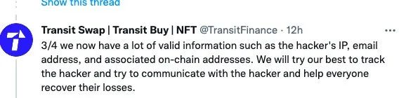 首先在今早发现被盗后,Transit Swap 技术团队紧急暂停服务,无法进行任何操作,很多用户也在社交平台纷纷表示自己钱包的资产被盗。