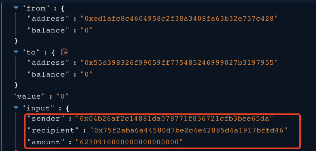 https://bscscan.com/tx/0x181a7882aac0eab1036eedba25bc95a16e10f61b5df2e99d240a16c334b9b189https://etherscan.io/tx/0x743e4ee2c478300ac768fdba415eb4a23ae66981c076f9bff946c0bf530be0c7用户进行 swap 兑换时,正常流程是先通过 Transit Cross Router v3 合约选择路由合约,随后通过 Transit Swap&Cross Approve Proxy 合约进行权限验证后,调用 claimTokens 函数将用户兑换的 token 转入路由合约中。而 Transit Swap 合约实现时,上述三个合约均未对用户输入数据进行正确的验证,导致攻击者可以构造出任意指定的兑换数据 calldata,其中可以将授权过的用户的代币转入攻击者指定的任意地址之中。这个合约未对下面的 calldata 进行验证,解析后为下图的 input,里面指定了收款人为攻击者地址。攻击者就通过这种方式,共获利约 2100 万美元。随后将资金归集到获利地址 0x75F2abA6a44580D7be2C4e42885D4a1917bFFD46,但是项目方依然没有放弃,随后 Transit Swap 官方发布公告称,目前已确定黑客 IP、电子邮件地址,以及相关的链上地址。Transit Swap 团队表示将尽力追踪黑客,并尝试与黑客沟通,帮助用户挽回损失。