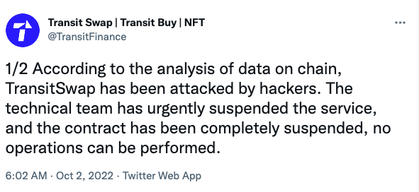 2022 年 10 月 2 日,据成都链安鹰眼 - 区块链安全态势感知平台舆情监测显示,Transit Swap 项目遭受攻击,被盗约 2100 万美元。关于本次事件,成都链安安全团队第一时间进行了分析。