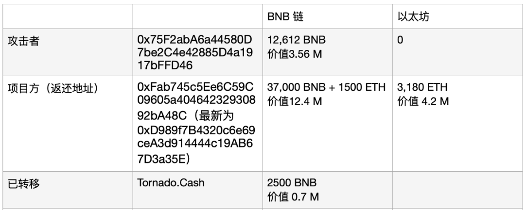 随着事件的影响力扩大,攻击者似乎也知道真实身份难保。也可能是被项目方“感化”,这位攻击者决定退回盗取的资产。截止发稿前,目前攻击者已将 BNB 链上的 37,000 BNB 和 1500 ETH,以太坊上的 3,180 ETH 归还给项目方。2500 BNB 被转移到 Tornado.Cash,剩余的 12,612 BNB 仍在攻击者地址上,价值约 356 万美元。成都链安链必追 - 虚拟货币案件智能研判平台正在对被盗资金进行实时追踪。从本次事件,我们可以看到,合约授权依然潜藏着诸多风险。成都链安安全团队在这里提醒所有授权过该项目的用户,尽快取消授权,或转移资金到新钱包。同时建议项目方在项目实现时,务必对用户输入进行彻底的检查,也可以通过合约审计来规避此类问题。作为一家致力于区块链安全生态建设的全球领先区块链安全公司,也是最早将形式化验证技术应用到区块链安全的公司,成都链安目前已与国内外头部区块链企业建立了深度合作;为全球 2500 多份智能合约、100 多个区块链平台和落地应用系统提供了安全审计与防御部署服务。成都链安同时具备全链条打击虚拟货币犯罪和反洗钱技术服务能力,为公安等执法部门提供案件前、中、后期全链条技术支持服务 1000+,包括数起进入混币器平台 Tornado Cash 的案件,成功协助破获案件总涉案金额数百亿。欢迎点击公众号留言框,与我们联系。