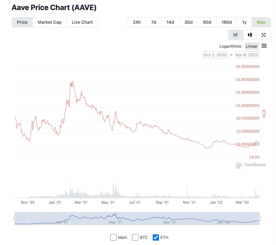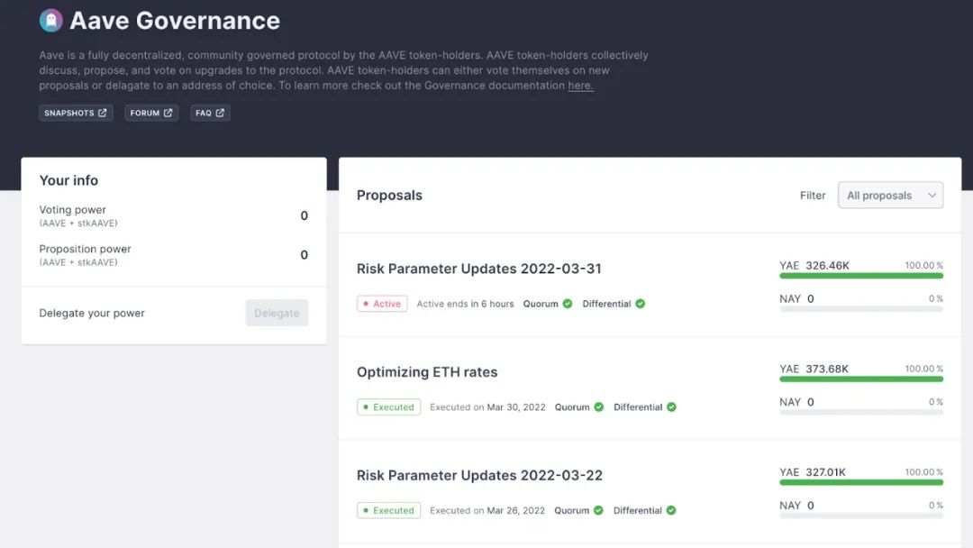 所以,这个代币目前对 ETH 升值情况良好,并支付了 44% 的股息。尽管你在 1 月买入 CVX 会是它价格的顶部,但这 3 个月大约 10%ROI 带来的收入,弥补了很大一部分从那时到现在的跌幅。对于一个代币的现金流,你最后要确保的将是它们是如何产生的。如果质押这些代币,仅仅只是让你挣取更多相同的代币,并且它们将代币释放到市场上,你不会真正的挣取什么东西,你只是在避免自己的代币价值不被稀释。你希望找到一个现金流是基于实际收入的项目,并且理想状态下,不会支付你正在质押的代币。Convex 是基于你的质押来支付各种各样的代币。在 Crypto Raiders 中,当你的 RAIDER 被质押时,你会基于在游戏中消费的 AURUM 获得返点。然而,对于目前的 Dopex,质押收入是以 DPX 和 rDPX 来支付的,这是一种代币释放的方式,直到它们的收入分成计划开始。所以,它的现金流系统并不像 Convex 那么好,但它至少减少了你在协议中的代币份额被稀释的压力。在不久的将来,这个系统会转换成真正的收入分成系统。对于我而言,现金流是利用代币获取收益最有趣的形式。如果它是一个你想持有的代币,那么持有它需要比仅仅只持有 ETH 更值得。除了对代币未来的价值上涨进行投资以外,现金流也是一种好方法。如果你十分喜欢一个协议,希望参与到他们的决策制定,那么治理是一种你可以去投资的代币利用的方法,即使它可能不满足我们上述提的一些标准,也可以对其进行投资。但 AAVE 的社区十分活跃,大多数的治理提案都能吸引到 25 万~40 万的投票: