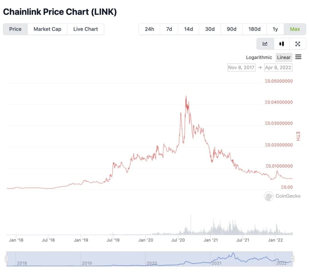 当我们正在了解一个代币时,第一个必须要弄清楚的问题是:你持有这个代币是为了用来支付协议的使用成本?还是为了投资?如果这是你应当花出去的代币,那么将没有任何长期持有它的意义。你可以在有需要的时候小批量买入。因此,明确这些代币可以作为什么用途,是你首先要研究的事情之一。例如,让我们看看 Chainlink 。Chainlink 是加密世界中最重要的服务之一。它绝对是维持 DApp 们稳定运行的核心基础设施。所以,买入 LINK 应当是一笔不错的投资,对吗?然而,除非你在 2019 年年中买入,否则情况并不像我们想的那样。看看下方的图表: