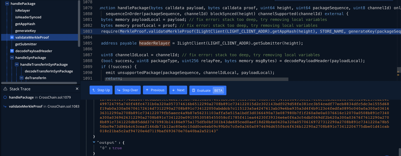 function handlePackage(bytes calldata payload, bytes calldata proof, uint64 height, uint64 packageSequence, uint8 channelId) onlyInit onlyRelayer sequenceInOrder(packageSequence, channelId) blockSynced(height) channelSupported(channelId) external { bytes memory payloadLocal = payload; // fix error: stack too deep, try removing local variables bytes memory proofLocal = proof; // fix error: stack too deep, try removing local variables require(MerkleProof.validateMerkleProof(ILightClient(LIGHT_CLIENT_ADDR).getAppHash(height), STORE_NAME, generateKey(packageSequence, channelId), payloadLocal, proofLocal), "invalid merkle proof"); address payable headerRelayer = ILightClient(LIGHT_CLIENT_ADDR).getSubmitter(height); ... ... if (packageType == SYN_PACKAGE) { address handlerContract = channelHandlerContractMap[channelIdLocal]; tryIApplication(handlerContract).handleSynPackage(channelIdLocal, msgBytes) returns (bytes memory responsePayload) { if (responsePayload.length!=0) { sendPackage(channelSendSequenceMap[channelIdLocal], channelIdLocal, encodePayload(ACK_PACKAGE, 0, responsePayload)); channelSendSequenceMap[channelIdLocal] = channelSendSequenceMap[channelIdLocal] + 1; } } ... ... } ... ... IRelayerIncentivize(INCENTIVIZE_ADDR).addReward(headerRelayer, msg.sender, relayFee, isRelayRewardFromSystemReward[channelIdLocal] || packageType != SYN_PACKAGE); } 输入参数{ "payload": "0x000000000000000000000000000000000000000000000000000000000000000000f870a0424e4200000000000000000000000000000000000000000000000000000000009400000000000000000000000000000000000000008ad3c21bcecceda100000094489a8756c18c0b8b24ec2a2b9ff3d4d447f79bec94489a8756c18c0b8b24ec2a2b9ff3d4d447f79bec846553f100", "proof": "0x0a8d020a066961766c3a76120e00000100380200000000010dd85c1af201f0010aed010a2b0802100318b091c73422200c10f902d266c238a4ca9e26fa9bc36483cd3ebee4e263012f5e7f40c22ee4d20a4d0801100218b091c7342220e4fd47bffd1c06e67edad92b2bf9ca63631978676288a2aa99f95c459436ef632a20da657c1ffb86c684eb3e265361ef0fa4f9dfa670b45f9f91c5eb6ad84b21a4d112001a370a0e0000010038020000000000000002122011056c6919f02d966991c10721684a8d1542e44003f9ffb47032c18995d4ac7f18b091c7341a340a0e00000100380200000000010dd85c12202c3a561458f8527b002b5ec3cab2d308662798d6245d4588a4e6a80ebdfe30ac18010ad4050a0a6d756c746973746f726512036962631ac005be050abb050a110a066f7261636c6512070a0508b891c7340a0f0a046d61696e12070a0508b891c7340a350a08736c617368696e6712290a2708b891c7341220c8ccf341e6e695e7e1cb0ce4bf347eea0cc16947d8b4e934ec400b57c59d6f860a380a0b61746f6d69635f7377617012290a2708b891c734122042d4ecc9468f71a70288a95d46564bfcaf2c9f811051dcc5593dbef152976b010a110a0662726964676512070a0508b891c7340a300a0364657812290a2708b891c73412201773be443c27f61075cecdc050ce22eb4990c54679089e90afdc4e0e88182a230a2f0a02736312290a2708b891c7341220df7a0484b7244f76861b1642cfb7a61d923794bd2e076c8dbd05fc4ee29f3a670a330a06746f6b656e7312290a2708b891c734122064958c2f76fec1fa5d1828296e51264c259fa264f499724795a740f48fc4731b0a320a057374616b6512290a2708b891c734122015d2c302143bdf029d58fe381cc3b54cedf77ecb8834dfc5dc3e1555d68f19ab0a330a06706172616d7312290a2708b891c734122050abddcb7c115123a5a4247613ab39e6ba935a3d4f4b9123c4fedfa0895c040a0a300a0361636312290a2708b891c734122079fb5aecc4a9b87e56231103affa5e515a1bdf3d0366490a73e087980b7f1f260a0e0a0376616c12070a0508b891c7340a300a0369626312290a2708b891c7341220e09159530585455058cf1785f411ea44230f39334e6e0f6a3c54dbf069df2b620a300a03676f7612290a2708b891c7341220db85ddd37470983b14186e975a175dfb0bf301b43de685ced0aef18d28b4e0420a320a05706169727312290a2708b891c7341220a78b556bc9e73d86b4c63ceaf146db71b12ac80e4c10dd0ce6eb09c99b0c7cfe0a360a0974696d655f6c6f636b12290a2708b891c73412204775dbe01d41cab018c21ba5c2af94720e4d7119baf693670e70a40ba2a52143", "height": 110217401, "packageSequence": 17684572, "channelId": 2}handlePackage 会进一步调用 MerkleProof.validateMerkleProof 对输入的 proof 进行校验: