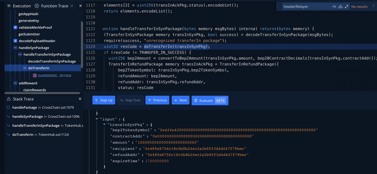 利用黑客攻击交易数据,基于 BNBChain 单元测试代码,增加了基于黑客攻击交易的测试用例,可以完整复现黑客的攻击交易。单元测试代码利用 iavlMerkleProofValidate.Run 接口验证输入数据,即相当于调用预编译合约。https://github.com/BananaLF/bsc/blob/bsc-hack/core/vm/contracts_lightclient_test.go#L99-L100