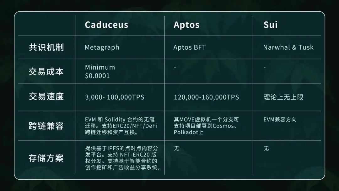 Aptos:一个正式的工具“Move Prover”,它允许开发人员快速验证和测试他们的代码是否按预期执行,通过其原生数据类型“资源”安全存储重要信息(代币、智能合约)。Sui:Developer Kit (SDK) 旨在优化开发人员用户体验,为开发人员提供开源、多功能和用户友好的工具。此外,SDK 将减少大量开发人员在调试智能合约、等待审计和构建基本技术堆栈元素上花费的时间。但 Aptos 和 Sui 对于开发人员引入上共同存在的问题是,尽管 Move 语言和相关编程框架具有这样或那样的优势,但是其与市场主流的 Solidity 语言并不兼容,开发人员需要重新编写代码才能在 Aptos 和 Sui 上部署应用,一个是学习成本,另外一个是 Solidity 语言背后庞大原始积累的机会成本问题。Caduceus:由于元宇宙商业场景下,公链生态项目发展要更加复杂,同时为了降低开发者进入门槛,Caduceus 在对开发者的支持上要更加全面和强力。首先是深度模块化,支持各底层和开发模块可快速插拔装配,能够快速定制化组装项目的区块链系统。另外一个重要之处是高度标准化包括支持开发者友好的开源协议和软件源代码,推进多个技术体系标准化。Caduceus 提供了支持 3D 游戏素材 / 模型的创作⼯具以及相关 NFT 铸造交易及拆分工具。同时构建了一个包括显示终端、计算中心、操作系统及界面的开源软硬件平台 Caduceus Creation Platform,支持大屏、图表、多种形式的界面交互管理、监控、运维。配合全套 XR 算法包、XR 开发套件,无缝衔接 Unity3D VR、UE4/UE5、Omniverse 引擎等主流生产力工具。更重要的是考虑到当前市场以太坊在公链生态领域的强大底蕴和开发人员规模,Caduceus 支持 EVM、Solidity 合约的无缝迁移,同时无缝对接包括 ERC-20、ERC-721、ERC-1155、ERC-998 在内的多种资产协议,可以快速承接以太坊及同系生态的开发者转移。Aptos:twitter 粉丝 22.5 万,Discord 成员 12.3 万Sui:twitter 粉丝 8.5 万,Discord 成员 13.2 万Caduceus:twitter 粉丝 12.6 万,Discord 成员 5.8 万Aptos:a16z,Multicoin,FTX Ventures,Jump Crypto,Tiger Capital,Katie Haun,Circle Ventures, Apollo.ParaF iCapital Oak HC/FT,Franklin Templeton,Superskrypt,GriffinGamingPartners。Sui:a16z,Redpoint,Coinbase Ventures,Standard Crypto,Slow Ventures, Scribble Ventures,Samsung NEXT,Electric Capital,NFX,Lightspeed VenturePartners。Caduceus:Susquehanna International Group,Bin Zayed Group,BlockFills,Qredo,TokenInsight,Nukkleus,Digital RFQ, Luna Venture Capital,SuperChainCapital,JackdawCapital、Luna VC。个人投资者包括传奇足球巨星 John Terry、英国体育传奇人物伊恩·博瑟姆勋爵、英国橄榄球世界杯冠军,前英格兰队长,世界橄榄球名人堂传奇人物 Lawrence Dallaglio,由 Ivan Atkinson 创立的好莱坞影视制作公司 One Van Films 等。