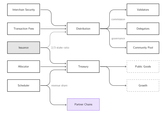 Cosmos Hub 的资金主要来源 ATOM 的增发通胀和分配器 / 协调器产生的收入,下图展示了资金流向: