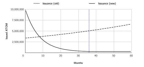 过渡阶段会持续 36 个月结束,之后网络将会处于稳定阶段,在此期间网络将每月增发 30 万 ATOM。尽管初始通货膨胀率很高,但在不到 10 个月的时间里,新模型的 $ATOM 通货膨胀率应该低于旧模型。