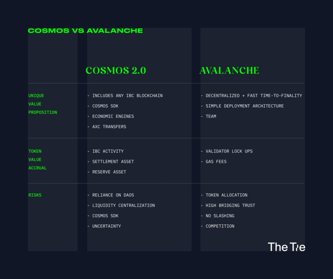 虽然理解 Avalanche 的架构存在前期复杂性,但 Avalanche 的协议部署架构仍然相对简单,因为它不需要 L2,即使 L2 也可能。这与新 Cosmos 2.0 经济引擎提出的许多技术、经济和博弈论考虑形成鲜明对比。