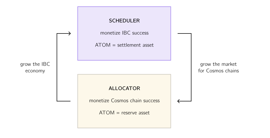 抵押的 ATOM 通过 IBC 活动累积价值,通过链间协调器进行结算,并通过链间分配器为跨链提供流动性。