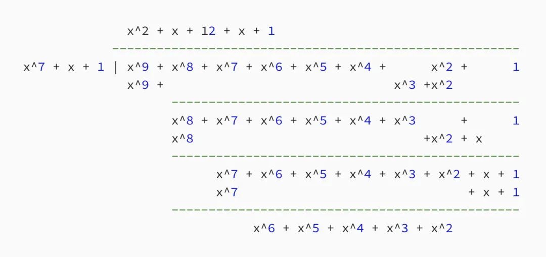 我们现在用这个值除以模数。在此例中,对于 GF(128),模数是 x⁷ + x +1: