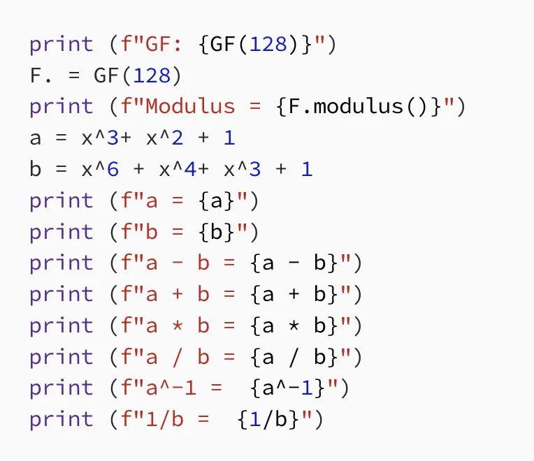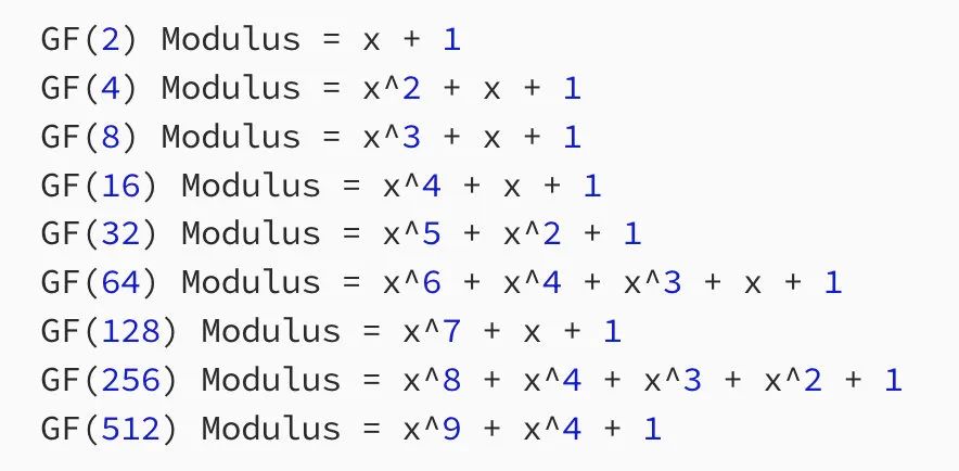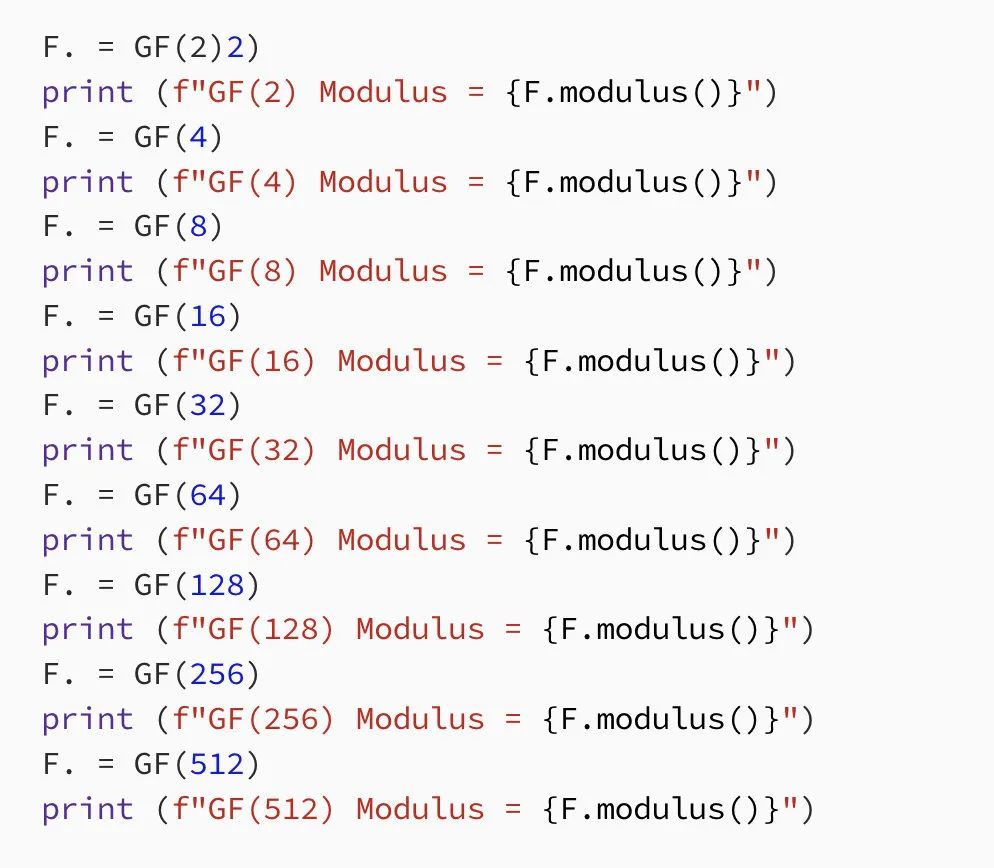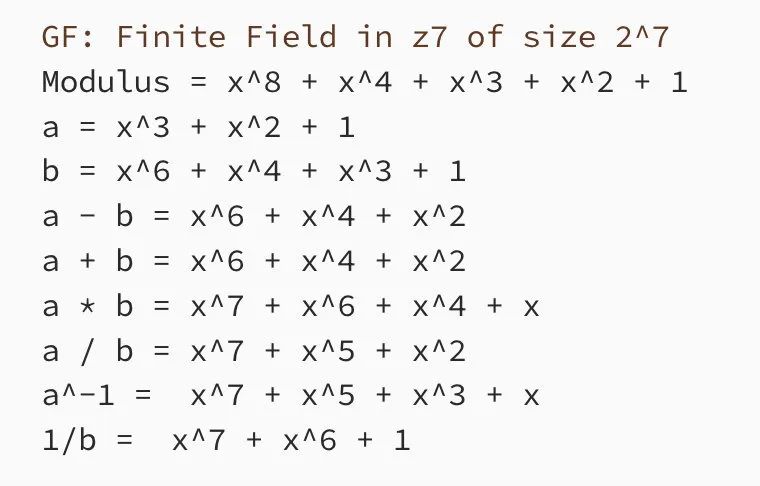 有限域或 Galois 域 (GF) 具有有限数量的元素,并且阶数等于素数 (GF(p)) 或素数的幂 (GF(2^ p ))。例如,GF(2^n) 有 2^n 个元素,它的元素被称为二元多项式 ( 其中多项式因子的系数要么为零,要么为一个值 )。为了将多项式减少到给定的大小,我们使用一个模数多项式,它除以输出值。对于 GF(128),我们可以使用 x ⁷+ x +1 的模数。