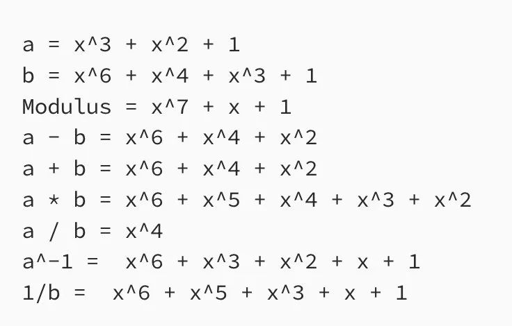 a × b =( x ³+ x ²+1)×( x ⁶+ x ⁴+ x ³+1)= x⁹ + x ⁷ + x ⁶+ x ³+ x ⁸+ x ⁶+ x ⁵+ x ²+ x ⁶+ x ⁴+ x ³+1= x ⁹+ x ⁸+ x ⁷ + x ⁵+ x ⁴+ x²+1