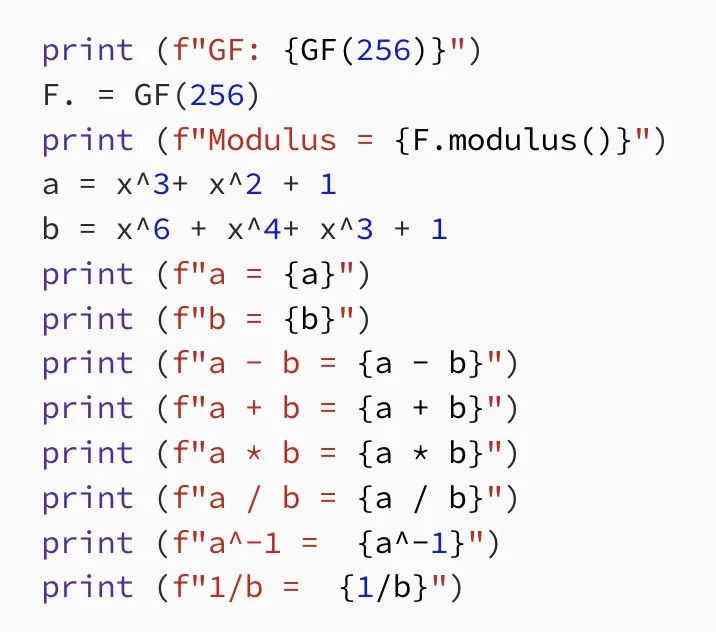 我们的不可约多项式是 x、x²、x²+x+1 和 x³+x²+1。它们等价于我们在传统公钥加密方法中使用的素数,并类似于 (mod p) 运算。一种常用的方法是 x⁸+x⁴+x³+x+1,用于 AES 加密。在 Sage 中,我们可以定义自己的模数,例如: