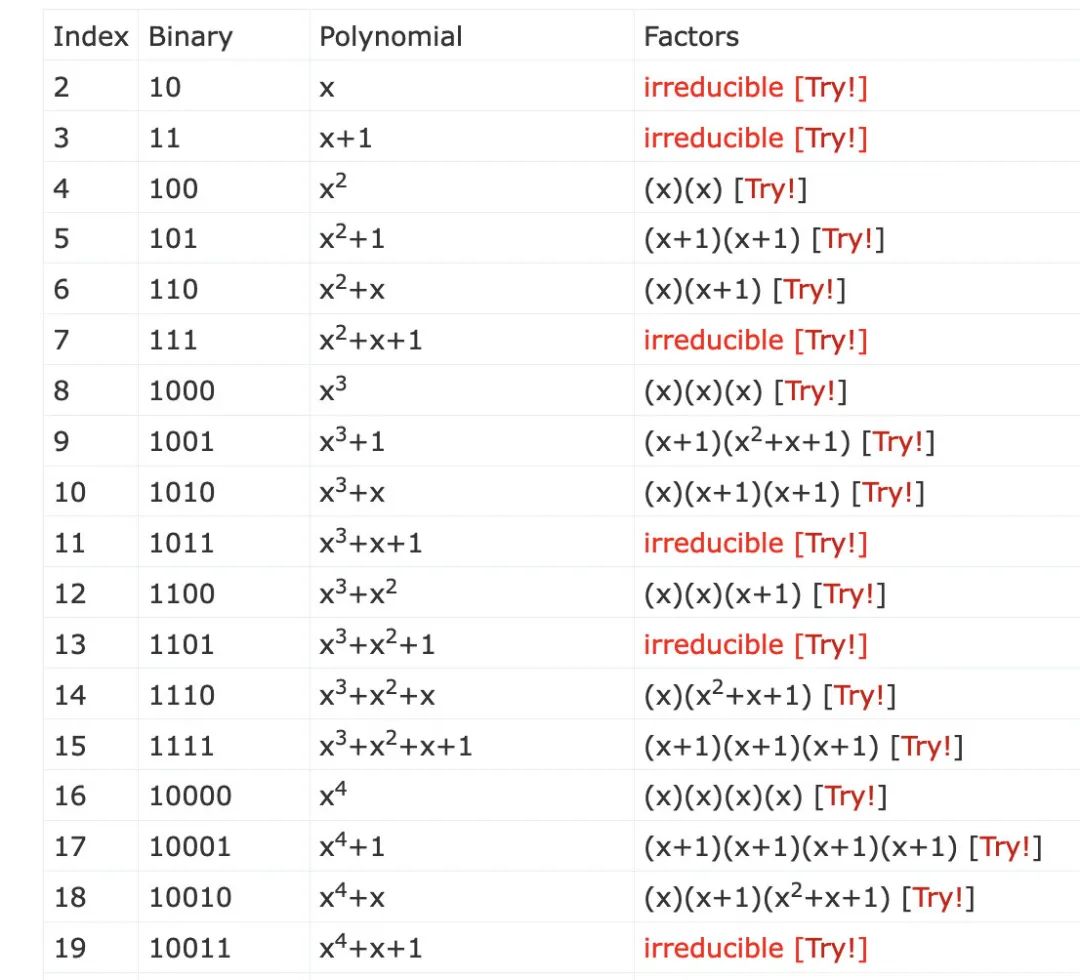 就像公钥加密中的素数一样,我们需要一个不能被任何数整除的多项式。为此,我们使用一个不可约多项式。不可约多项式的例子有:
