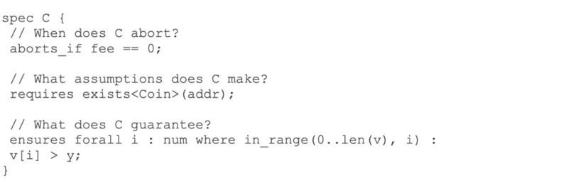 规范语言是 Move 的一个集成部分。规范被分离成 spec block。spec block 指定了函数的前置条件(requirements)和后置条件(ensures)。