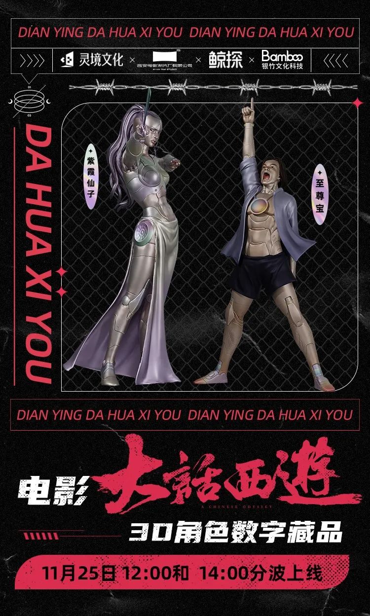 本期灵境文化携手银竹文化团队,向经典致敬,用机械金属质感的形式对电影中的经典形象进行二次创作,包括紫霞仙子、白晶晶、至尊宝、孙悟空、牛魔王五位经典角色。将本来给人冰冷的金属机械与经典电影 IP 形象结合在一起,通过金属机械的电影角色造型,可以看到人物冰冷冷酷的外表下隐藏着热烈的爱情。时间会流逝、经典永流传,通过数字艺术将人们喜爱的电影角色二次创作,传递出数字时代下的机械之美。所有藏品将于11 月 25 日 12:00/14:00在淘票票灵境商城限量发行,每款限量发行 6000 份。