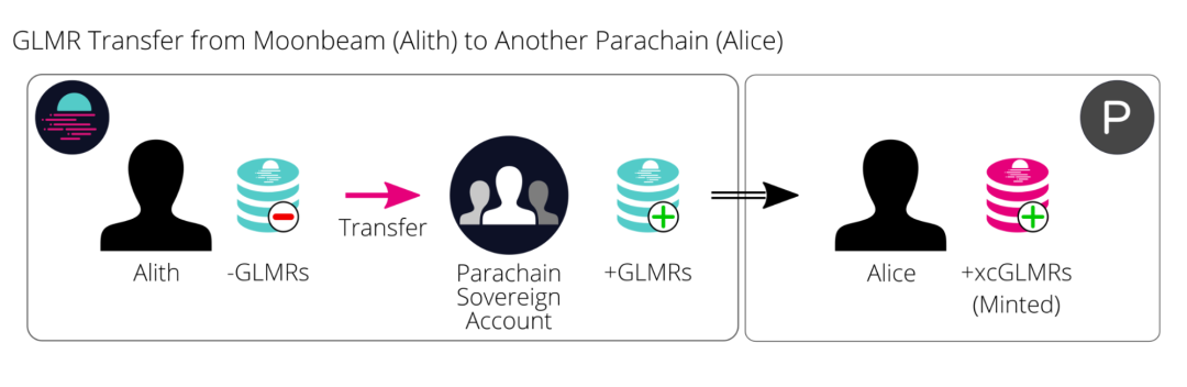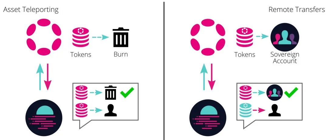 远程转移,通过在初始区块链上由目标区块链所拥有的中间账户将资产转移至目标区块链。此中间账户称为“主权”账户。在此情况下,原本链上的资产将不会被销毁,而是由主权账户持有。而 XCM 的执行将会在目标链上铸造包装(又称“虚拟”或是“跨链”资产)的相应资产至目标地址。此包装资产将能够永远以 1:1 的比例与原生资产兑换。此机制类似于锁仓铸造或是销毁解锁的桥接机制。