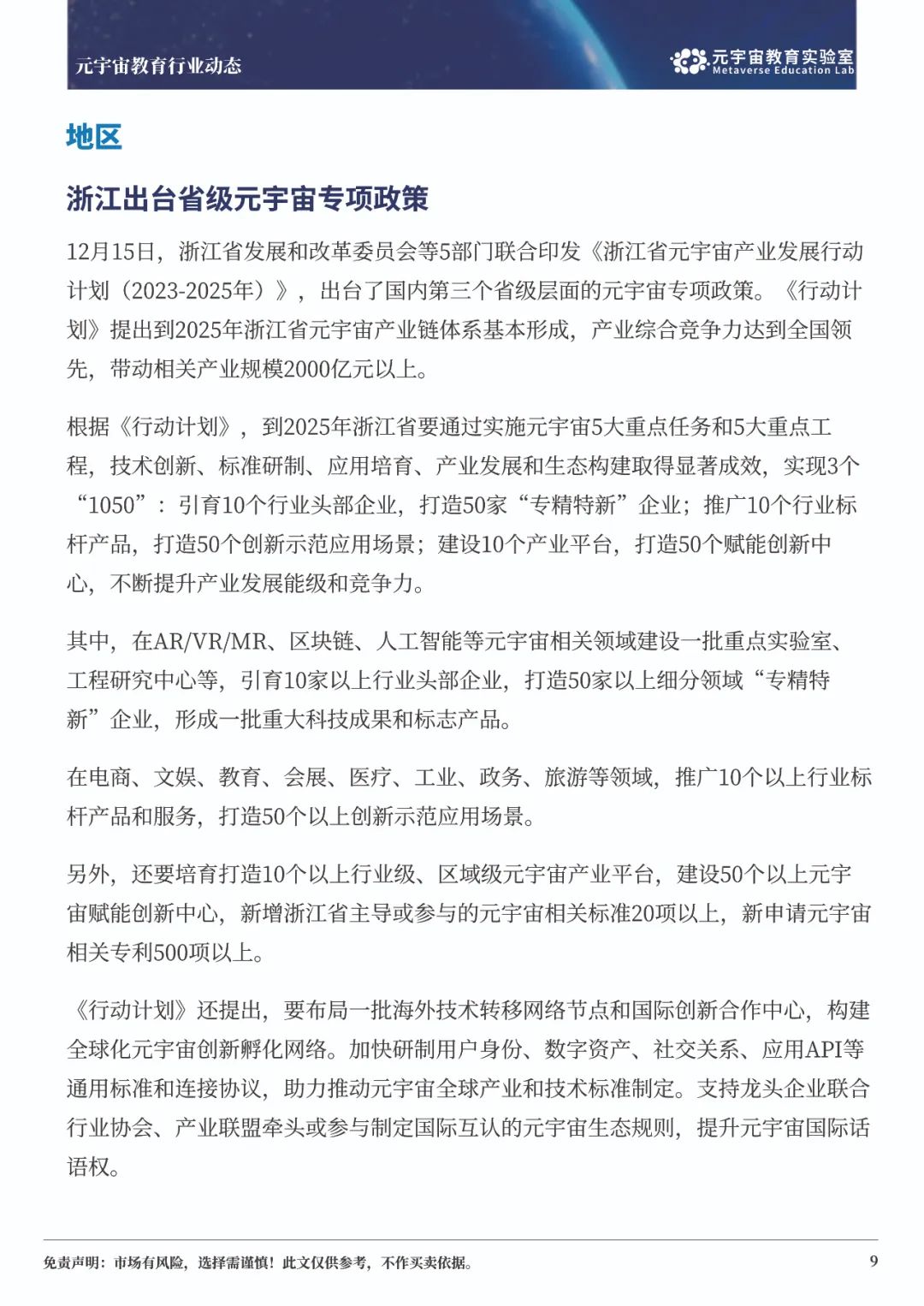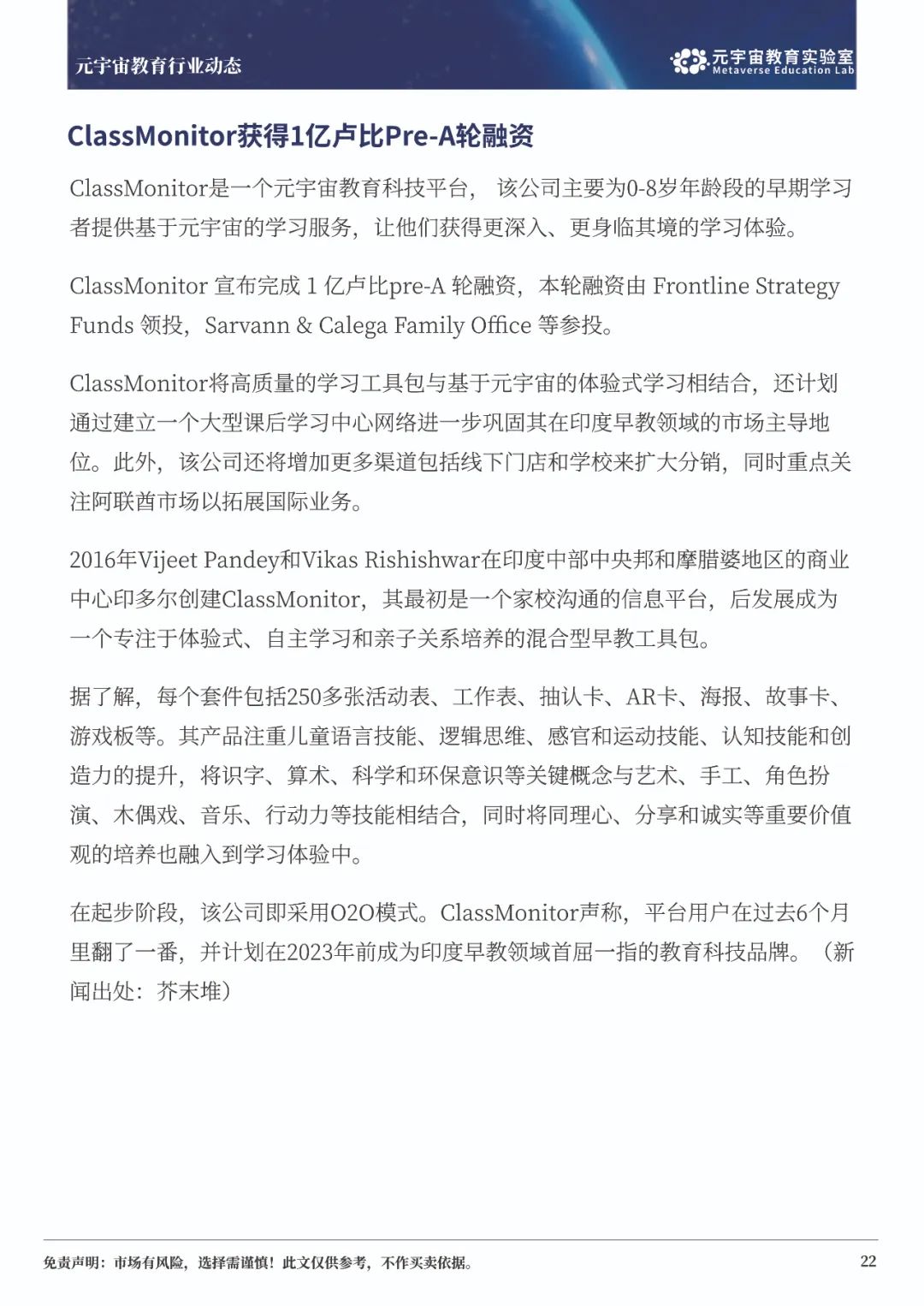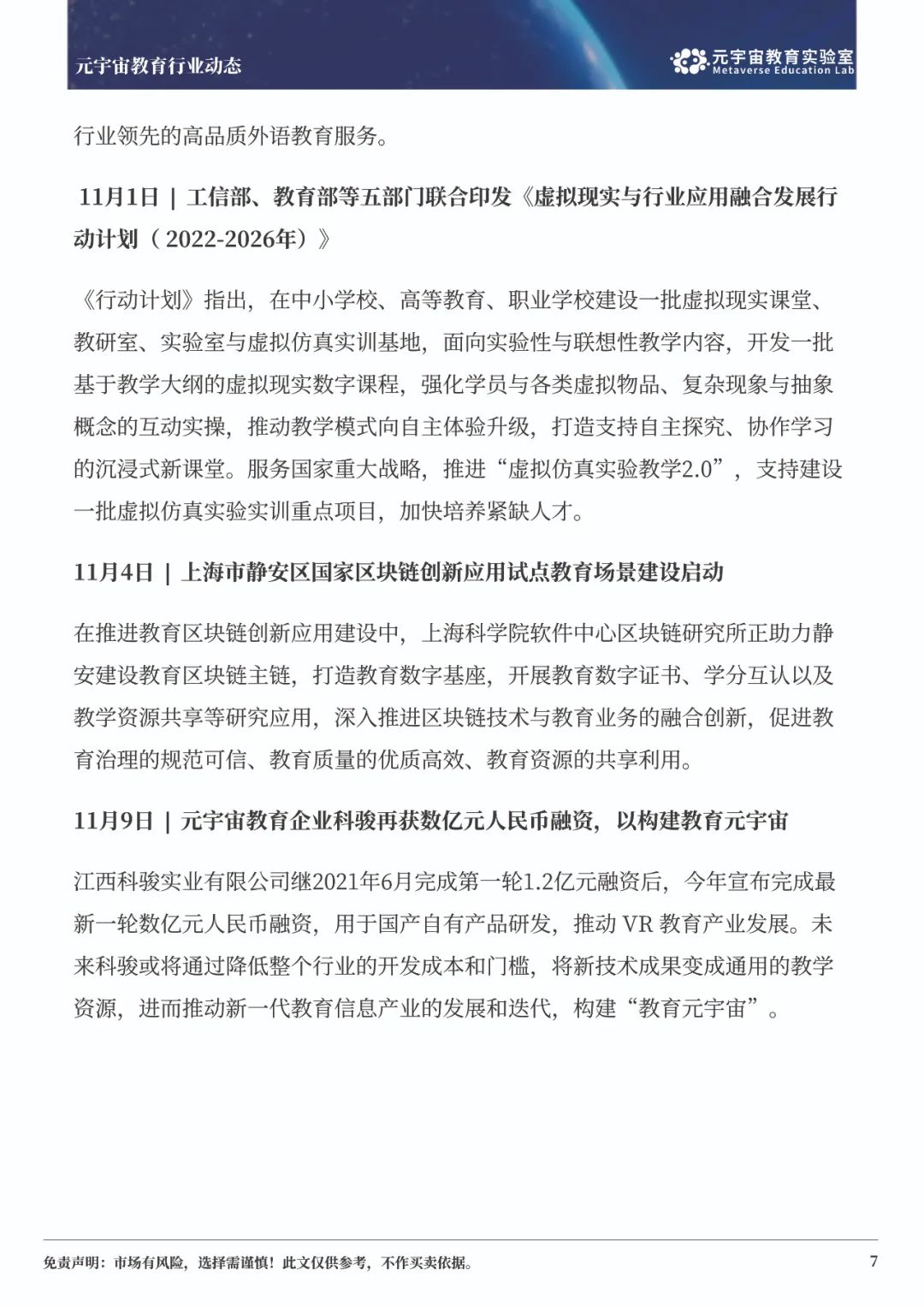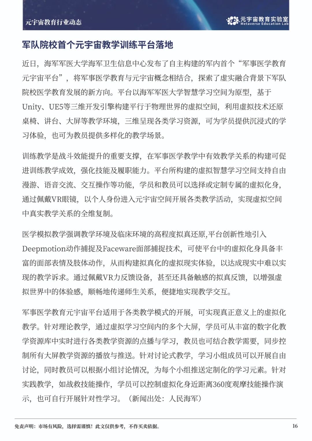 元宇宙教育正在全球范围内快速发展,为帮助全行业建立全局视角,以把握行业风向、判断产业机会、寻找业务思路,元宇宙教育实验室将每月发布一篇元宇宙教育行业动态报告。
