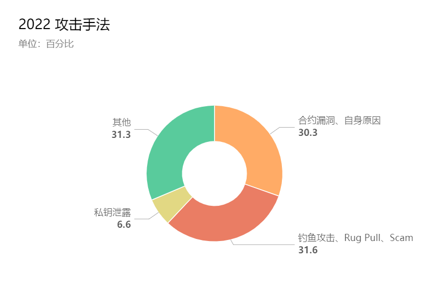 303 起安全事件中,攻击手法主要分为三类:由项目自身设计缺陷和各种合约漏洞引起的攻击;包含 Rug Pull、钓鱼、Scam 类型的手法;由私钥泄露引起的资产损失。