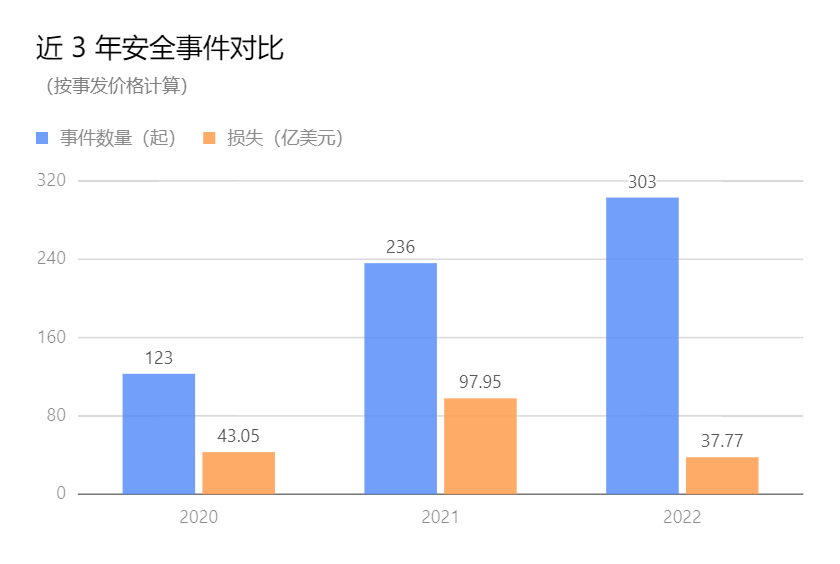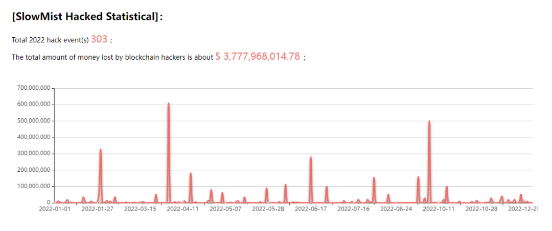 根据慢雾区块链被黑事件档案库(SlowMist Hacked)统计,2022 年安全事件共 303 件,损失高达 37.77 亿美元(按事发价格计算)。