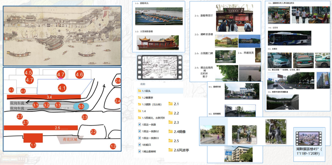 如果根据古图的大致位置,复原成 2023 年现代版的西湖全景图,首先就要“考古”,摸清哪些景观还存在,哪些没有了,并且需要确定它们在今天西湖边的位置。其次,要采风、考察今天西湖边哪些可以入画的新景观。