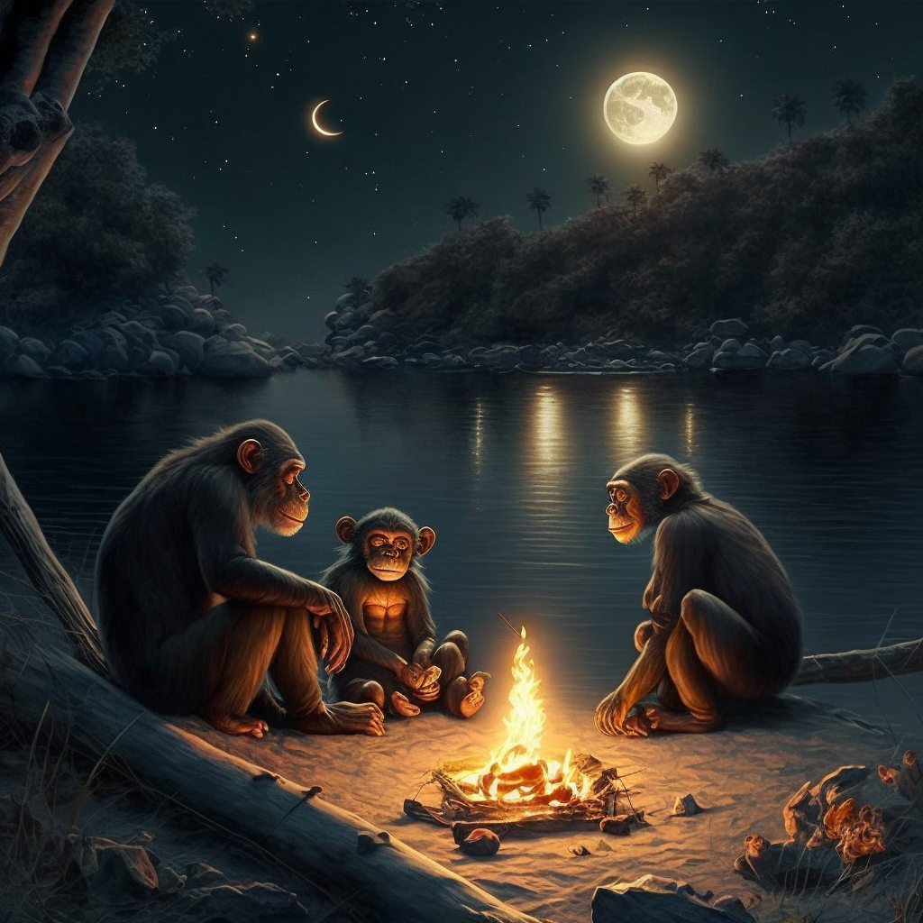 智人们在夜晚围着篝火讲故事,图为 AI 图片生成工具 Midjourney 生成