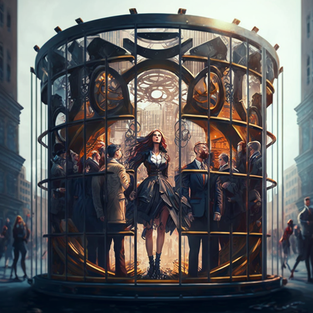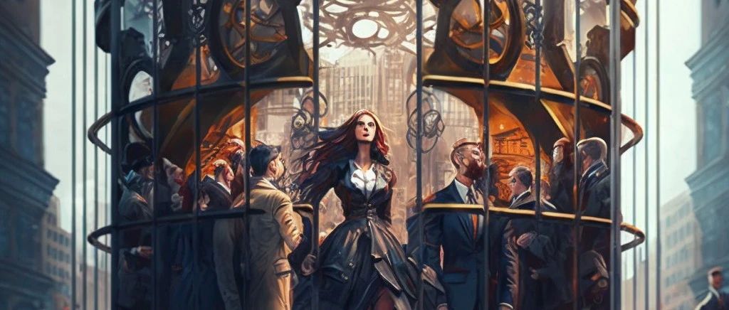 大都会的隐喻是资本与科技高度发达的资本控制主义的社会形态,在机械化运转的社会中,底层劳动人民被资本统治阶级长期压榨,作为系统中快速转动的零部件与消耗品存在,一旦赛博朋克主义作为主导元宇宙的意识形态,那么我们将不可避免陷入元宇宙版本的大都会。人类到了命运的十字路口,到底是被数字化消费主义加速异化,还是掌握数字生产工具成为真正的超级个体呢?若我们还不警醒,当消费主义潜移默化成为构建数字社会的根本,当资本主义吞噬最后一块数字世界的主导权,我们将进入的数字世界将是一个披着天堂外衣的修罗场,我们将生活在现实与数字世界中无处不在的资本铁笼,每个人都插翅难飞。十字路口上的铁笼终于被撬开,图为 AI 图片生成工具 Midjourney 生成若我们不试图反抗,我们将会在元宇宙时代,看到消费主义之神将这样锻造我们命运的数字铁笼——