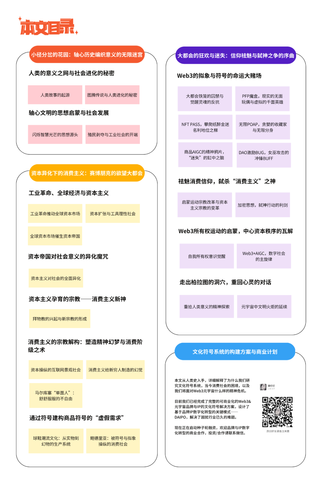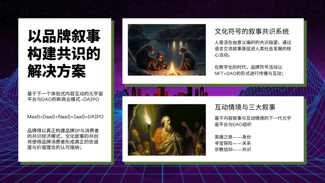柏拉图为处于黑暗洞穴中的人们送上火炬,带领人们走向出口,图为 AI 图片生成工具 Midjourney 生成当社会出现时代性的精神危机时,我们亦有必要回溯轴心精神,在历史中寻找答案。这个时期创造出伟大思想的贤哲们虽然在世界上的不同地域,但每一种思想传统都不约而同地给出了相同的答案,即“推己及人、关爱众生。”,博爱与仁慈,才是最重要的。仔细想想,事实上,无论是艺术、哲学还是信仰,都趋同于人类对爱的共情体验,这也是普世性宗教的共性。一切明智的利己主义都以自己的幸福为目标,一切美德的标准都以他人的幸福为目标。若文明的火炬得以延续,希望有一天,我们既可以探索茫茫星际宇宙,又能够与他人建立起真正的链接,在无限膨胀的孤独宇宙中,点亮人性不灭的光芒。自古以来世界上的任何文化冲突,都是围绕“符号共识”的定义权而发生的争夺,人类文明现在所面临的问题,也将不可避免地带入到元宇宙之中。若不理解符号的意义,也就无法理解问题的实质,更没有所谓对策。在 Web3 时代,人与品牌的共识关系范式将发生转移,将重构消费社会的底层秩序,品牌将出现革命性的叙事方式。——这是我们洞察到的未来之变,也是我们研究,并计划研发基于文化符号的共识系统的契机。你可以理解为这就是一个通过使用文化符号建立 Web3 元宇宙品牌与 IP 的 SAAS 管理与运营系统。你可能会问,它是否也会如前文所述,被资本操纵,答案是:是的,没错。而如何避免它被资本操纵,就在于完全将它公开,让每个人都可以用,从而了解幻境是如何被制造,加以思考人本身的意义,也许,我们就没有那么容易被蛊惑。最后,我们目前已经完成完整的可商业化的解决方案,计划将通过 DAOs to World 社区进行该方案的开发与合作,我们设计了基于品牌 IP 数字化转型的关键模式——DAIPO,解决了困扰行业已久的难题。总而言之,在推进 Web3&元宇宙的市场普及,帮助品牌实现真正的数字化转型,我们相信我们的工作,确实帮助行业往前推进了一大步。我们正在启动种子轮融资,也即将 Web3&元宇宙品牌数字化转型的商业合作,投资 / 合作请联系微信:chadengdeng