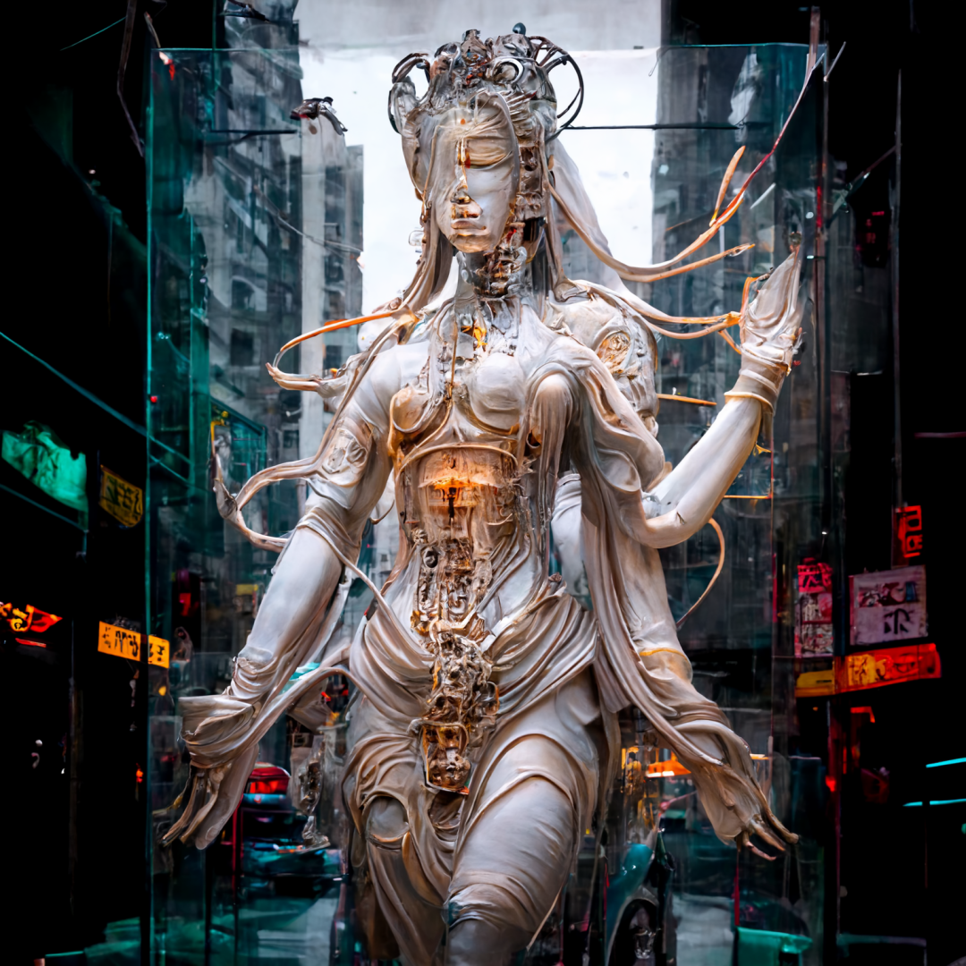 残缺的赛博朋克菩萨站在物欲横流的街头,图为 AI 图片生成工具 Midjourney 生成