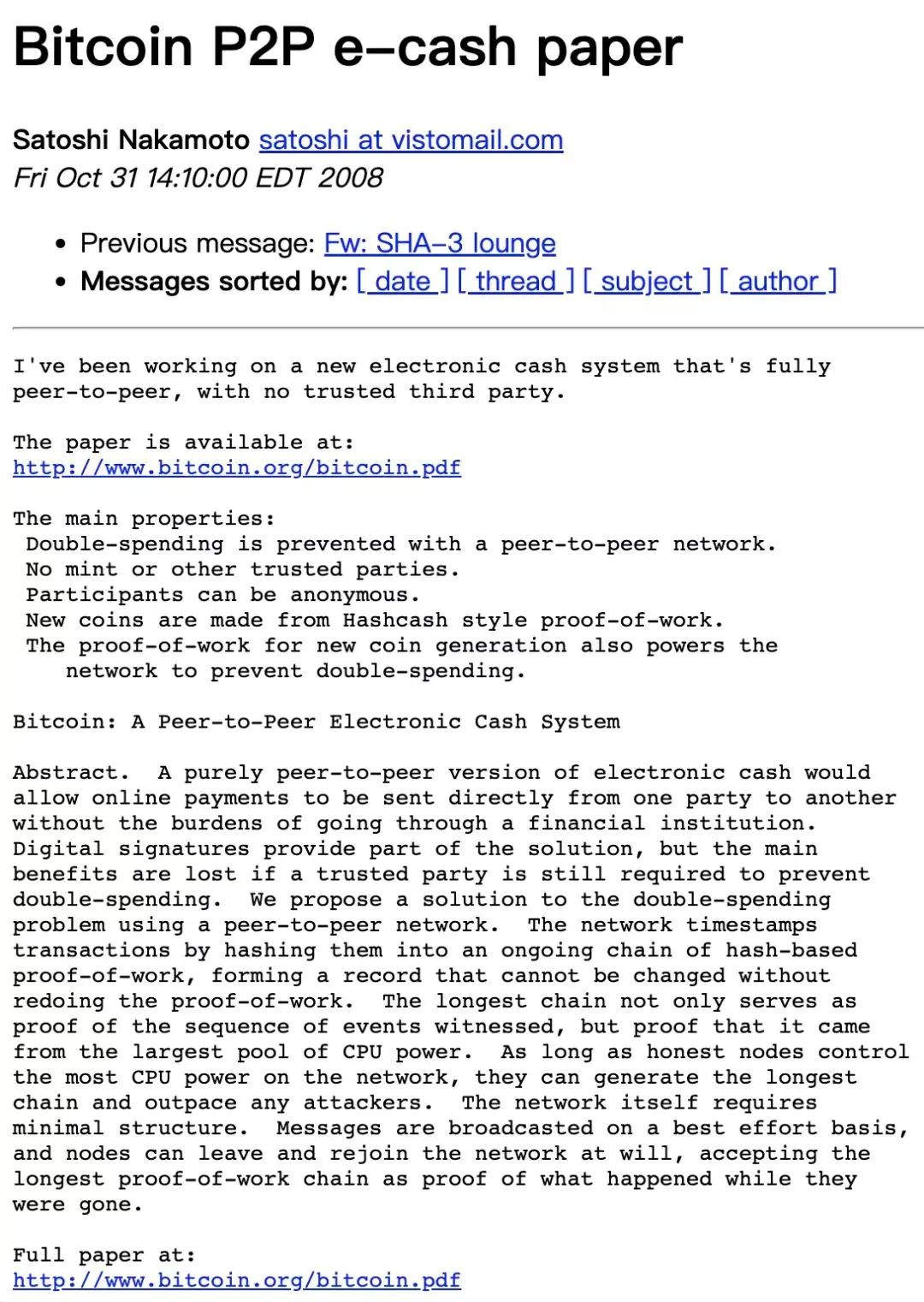 中本聪(Satoshi Nakamoto)在 P2P foundation 网站发布比特币白皮书