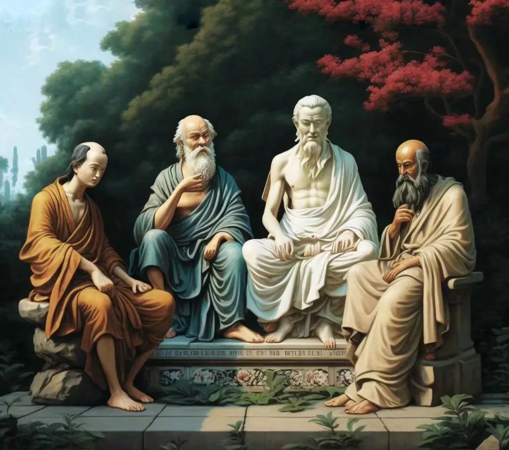 老子、苏格拉底、释迦牟尼、耶稣坐在花园中,图为 AI 图片生成工具 Midjourney 生成