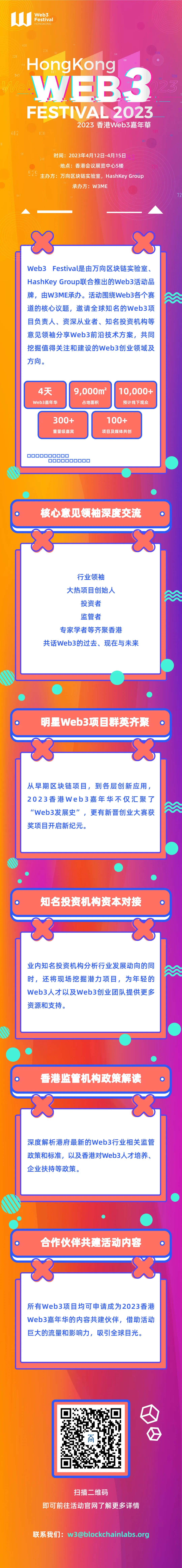 由万向区块链实验室、HashKey Group 联合主办,W3ME 承办的“2023 香港 Web3 嘉年华(Hong Kong Web3 Festival 2023)”早鸟票正在火热抢购中。本次活动设置早鸟票、常规票、晚鸟票以及 VIP 票四种类型,每个票种均为 4 天通票。所有用户一票在手,全场通行,可以在嘉年华期间,按照自己兴趣,自由参加 5 个会场的所有主题活动,与超过百家 Web3 各赛道优秀项目、社区和全球媒体互动交流,在 Open Stage 舞台欣赏丰富多彩的项目路演、NFT 展示及其他表演活动。VIP 票持有者可享受专属的签到通道、会场前排 VIP 区域座位等。早鸟票报名时间仅持续到 2 月 28 日,点击阅读原文即可购买。“2023 香港 Web3 嘉年华”将于 4 月 12 日 -15 日,与香港贸易发展局主办的“香港国际创科展(InnoEX)”,在香港会议展览中心同期举办。目前,香港特别行政区政府财政司司长陈茂波先生,大紫荆勋贤,GBS,MH,JP 已确认出席 4 月 12 日上午的开幕式,并发表演讲。本次嘉年华将设置 5 个会场,拟邀请 300 余位行业领袖、大热项目创始人、投资者、监管者、专家学者等齐聚香港,从技术基础设施、金融基础设施、应用、工具、市场趋势、投资等多个角度解答“Web3 正在发生什么”以及“将要发生什么”。本次活动也将专门邀请监管机构代表深度解析香港政府对 Web3 和虚拟资产行业最新的监管政策、监管标准和前行道路,帮助考虑落户香港的项目明晰其中的机遇和风险,以及香港对 Web3 人才的培养、对 Web3 企业的扶持政策等。主会场还将设置 AMA 环节,为 Web3 从业者与爱好者们提供与行业领袖面对面交流的机会。秉持 Web3“开放”、“共建”的精神,在 4 月 14 日至 15 日期间,主办方将招募具有创新性的项目举办周边活动,为参会者提供更多样的活动内容。同时,预计将有超 100 家热门项目、社区及媒体现场参展,为参会者展示当前最新的 Web3 技术和成果。本次嘉年华还将为年轻的 Web3 人才以及 Web3 创业团队提供更多资源和支持,帮助他们快速成长。大会将设置特别舞台,推动 Web3 学术交流以及年轻的 Web3 人才交流,为 Web3 的发展培养有生力量。另一方面,大会将为有意向参会的大学生群体提供免费门票,以激励更多年轻人加入 Web3 的生态建设中。在“2023 香港 Web3 嘉年华”,你可以从行业大咖们的交流和对话中走进 Web3 世界,也能从新秀项目的展示中了解最前沿的技术。大会现场还将设置 NFT 展览、热门话题研讨会等活动,无论你想了解行业动态,还是拓展业务或社交,这都是一场不容错过的行业嘉年华!