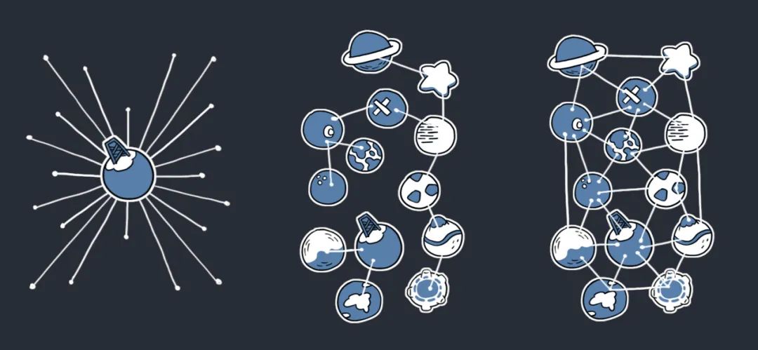 从左到右:集中式、联邦式、分布式(图片来源:https://docs.joinmastodon.org/)