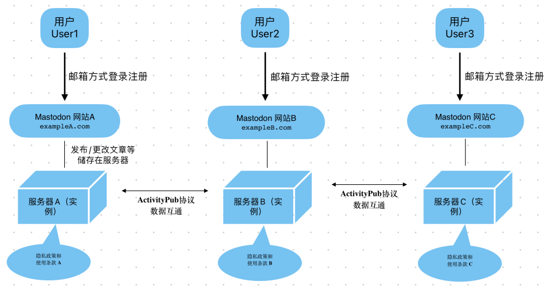 当用户 A 发布到了实例 A 上,实例 A 会储存该文章的所有数据,用户 B 在实例 B 关注了用户 A,此时实例 B 也会储存该文章的所有数据,用户 C 在实例 C 中未关注用户 A,那么实例 C 储存的就是该文章的部分元数据。