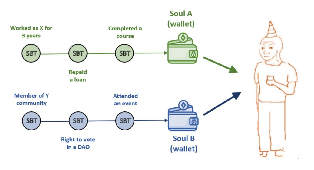 SBT 的一个决定性特征是其不可转让的性质。与当前的 ERC-20 和 ERC-721 等其他代币标准不同,SBT 不具有货币价值,因此不能买卖或转移到另一个钱包。这是因为它链接到每个人的灵魂“ Soul”。Souls 是用户存储 SBT 的账户。所以,SBT 也是一种去中心化身份系统。