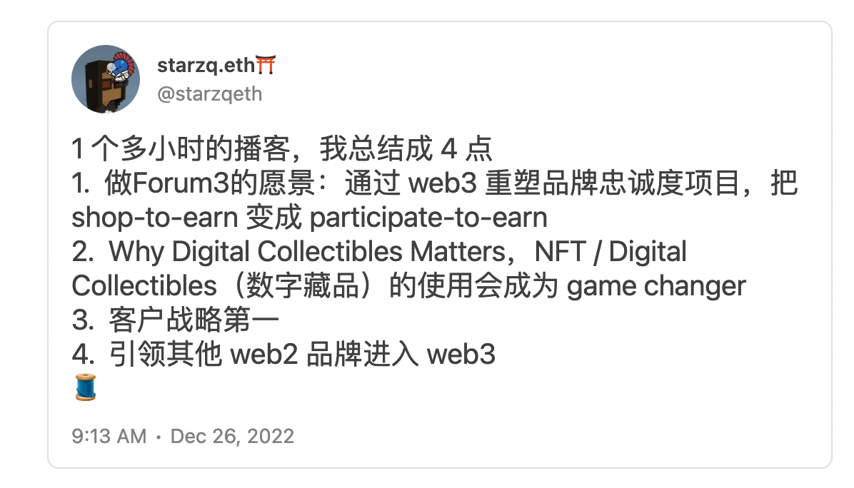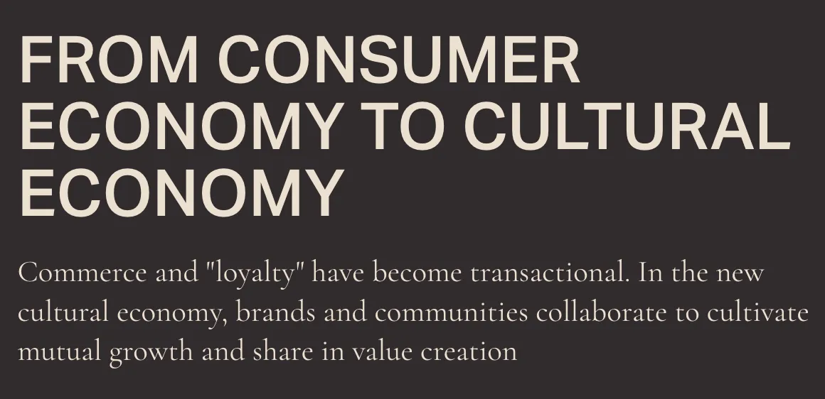 Tareq 非常同意 Forum3 的方法论(从 shop-to-earn 到 participate-to-earn,见下方推文),并做了更高层次的解读:这本质上是从消费者经济到文化经济的变迁(这段话也放在了 SMS 官网)