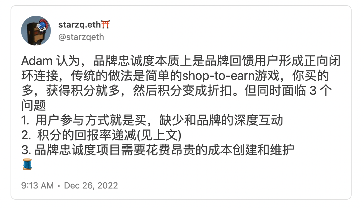 消费经济:消费即意义,用户渴望用消费来填满自己,这时对应的忠诚度计划就是 shop-to-earn, 你给我更多的消费频次,我给你更多的折扣, 非常交易导向。shop-to-earn 的问题我们之前已经分析过,此处不再赘述