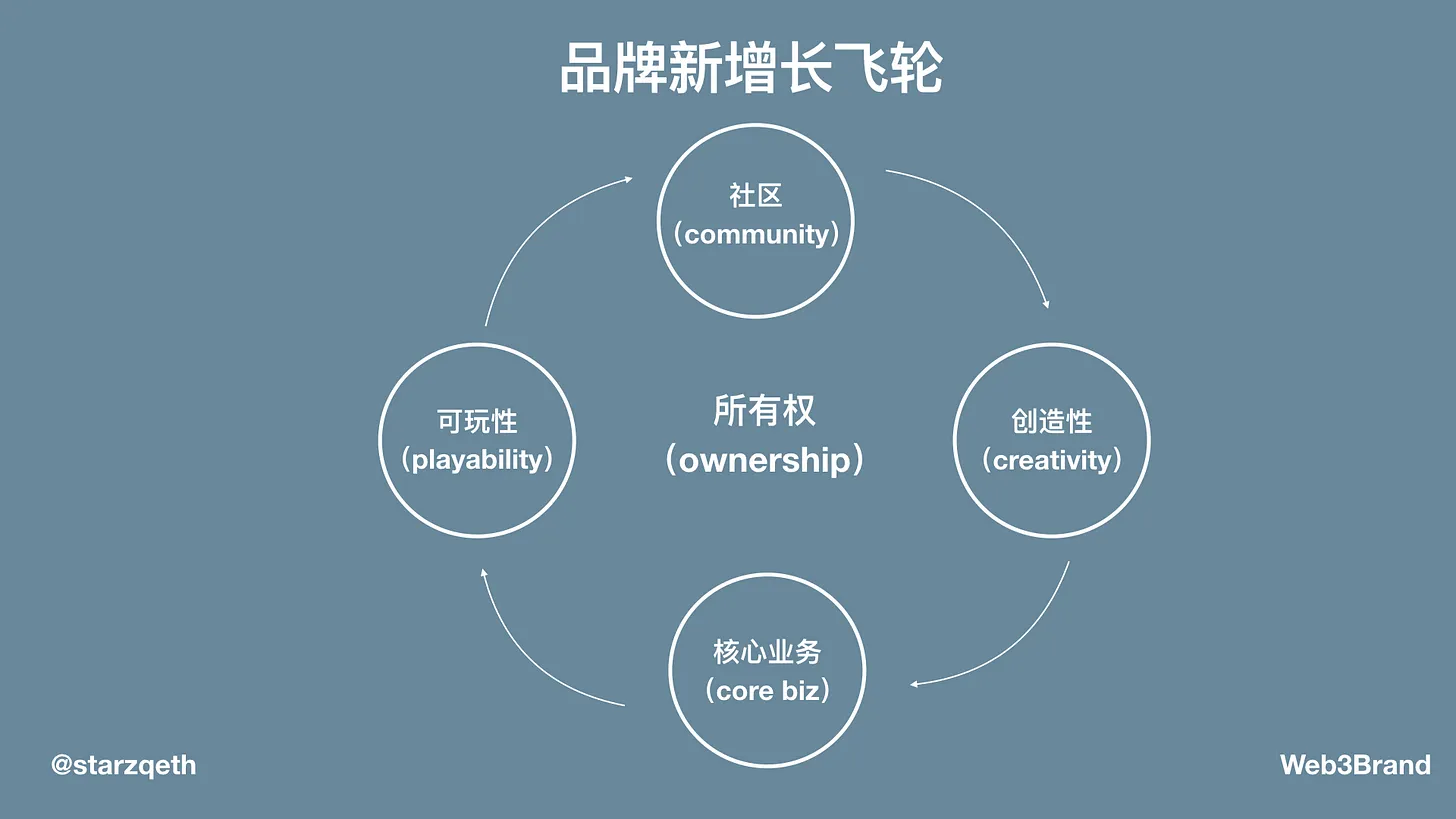 基于这 4 部分,品牌形成了新的增长飞轮:创造更多可玩性→建立社区获得更多的粉丝→粉丝自发创造→带来核心业务增长,所有权是保障这个飞轮转起来的基础。