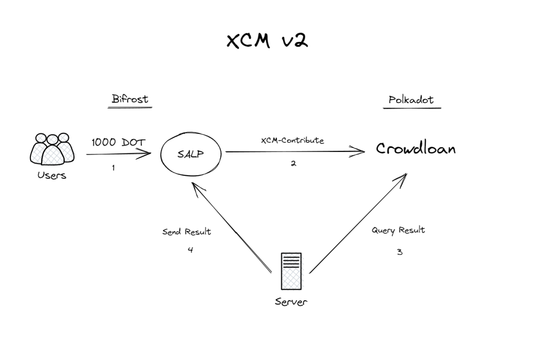 在 XCM 第二版中,需要一个多签服务器作为 Bifrost 和 Polkadot 之间的中继者,允许事件结果的远程传输。服务器必须通知 Bifrost 贡献是否成功,这样 Bifrost 就可以确保流动性 Crowdloan Token 被 Contribution fund 保留。