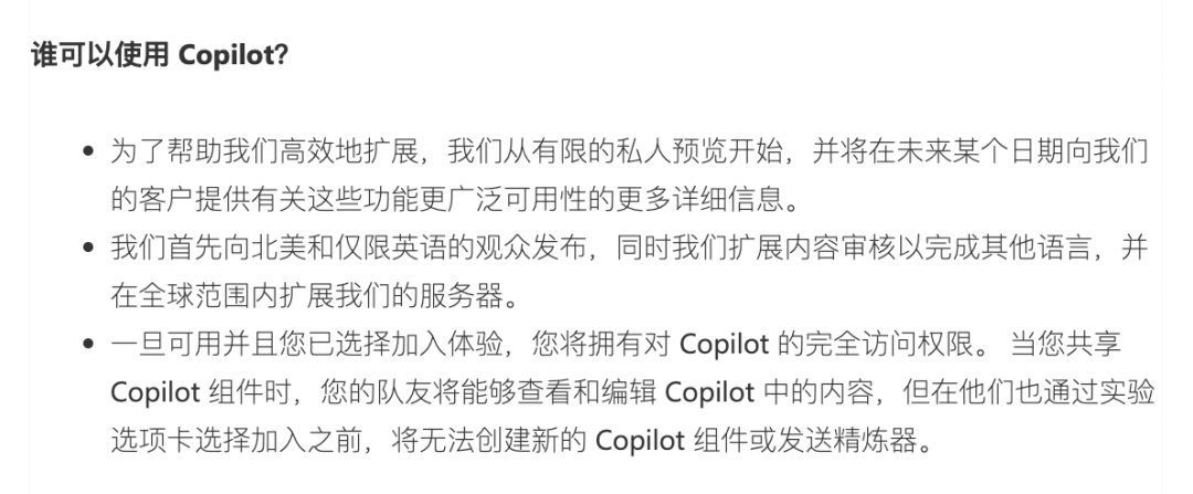 大部分人现在被微软的工具吸引都是因为集成了 AI 功能, Loop 也不例外。Loop 中整合了 Copilot ,但是 Copilot 目前并不对大部分用户开放。下面是官方的解释: