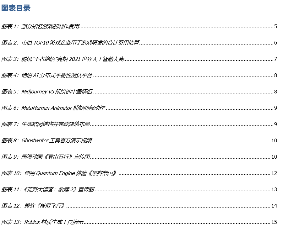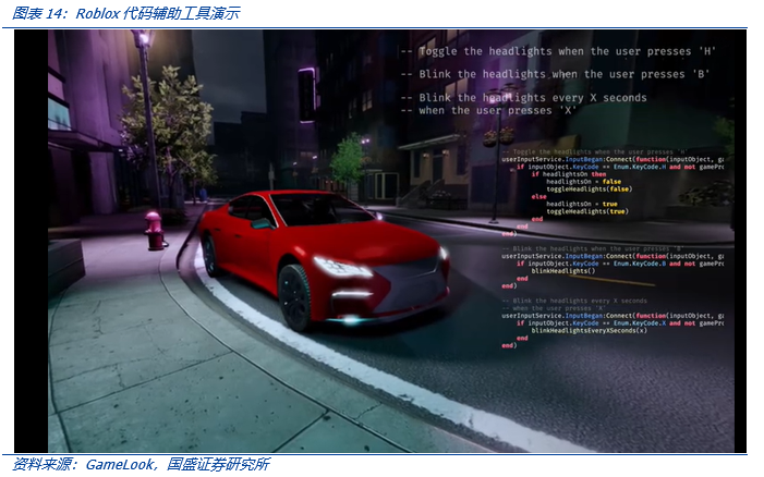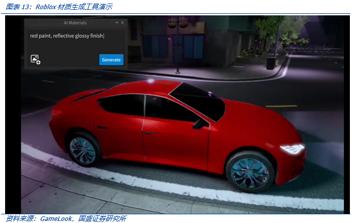 《Roblox》作为一款在全球拥有近一亿用户的沙盒游戏,同时也是目前世界上最大的多人在线游戏创作平台,包含了成千上万玩家创造的地图、玩法和模式。其平台由 Roblox Client, Roblox Studio 和 Roblox 云三部分构成,其中 Roblox Studio 提供了一套适用于新手到专业人员的工具,给予了开发者足够的创作空间和技术帮助。2023 年 3 月 21 日,Roblox 正式发布了两款新的 AIGC 工具,所有 Roblox 的开发者都可以选择使用 AI 为基础的材质生成和代码辅助工具。其中,Roblox 的材质生成可以用来创作高品质纹理,并运用在游戏内物体上;而代码辅助工具可以让用户通过自然语言指令创造代码,也可以自动总结用户所写的代码并生成评论。可以预见,AIGC 使得游戏的 UGC 时代即将来临,游戏内容与游戏体验将进一步获得提升。